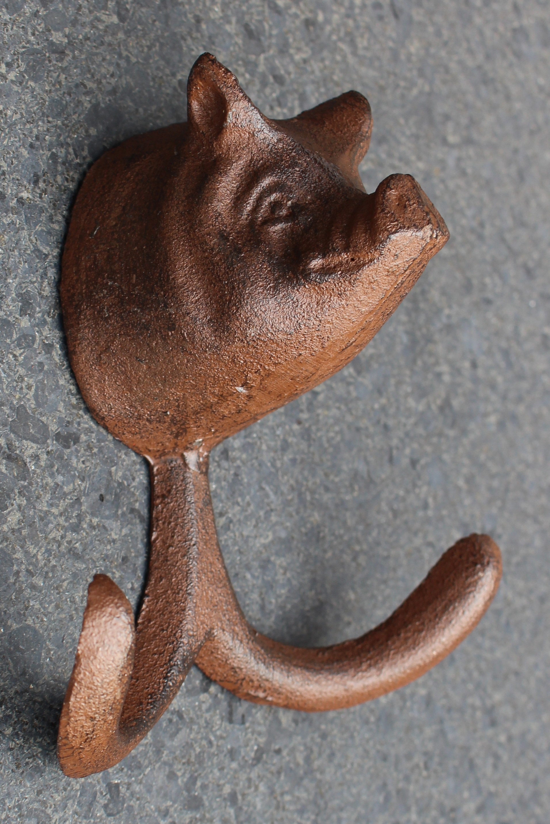 Gietijzeren kapstokhaak met een kop van een varken of big. De dubbele