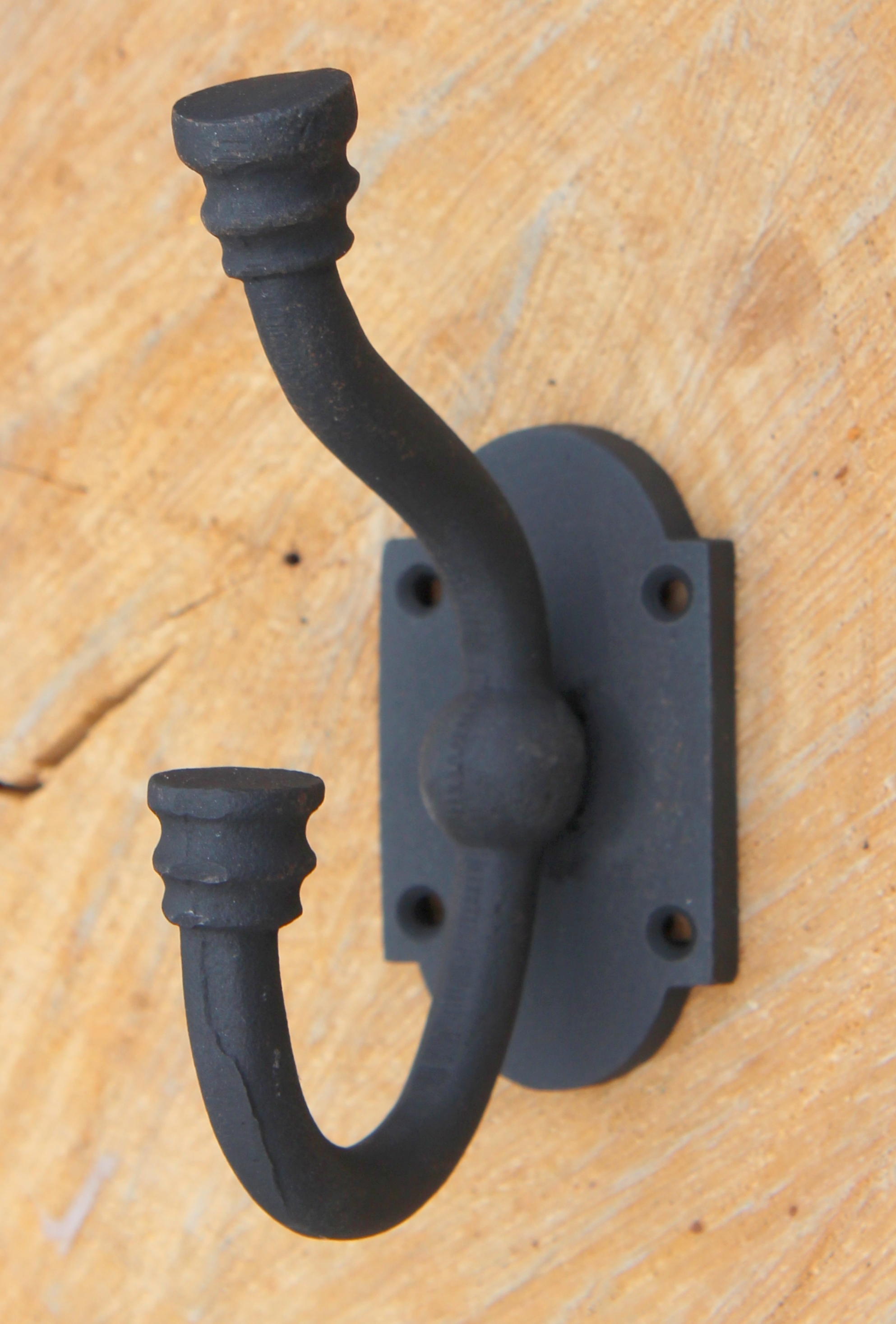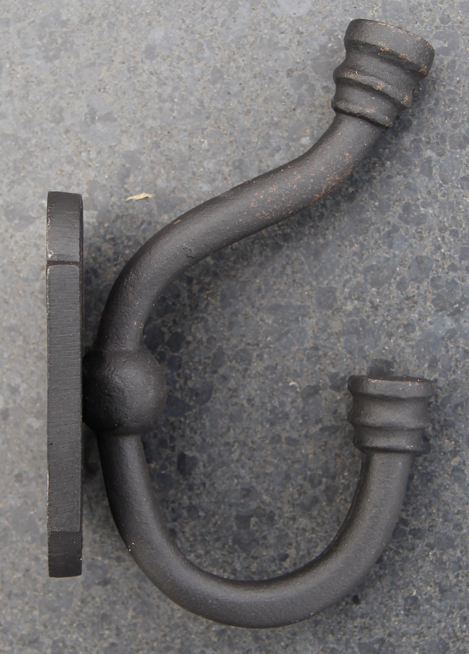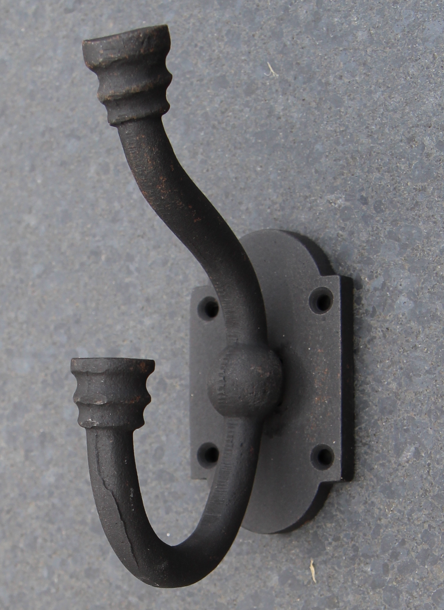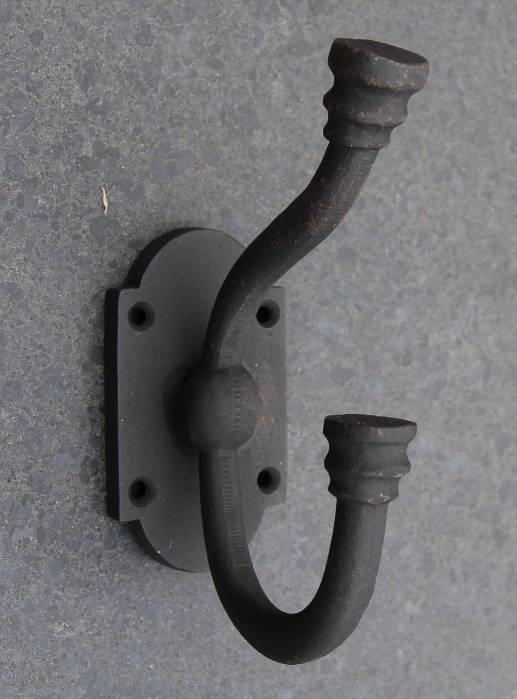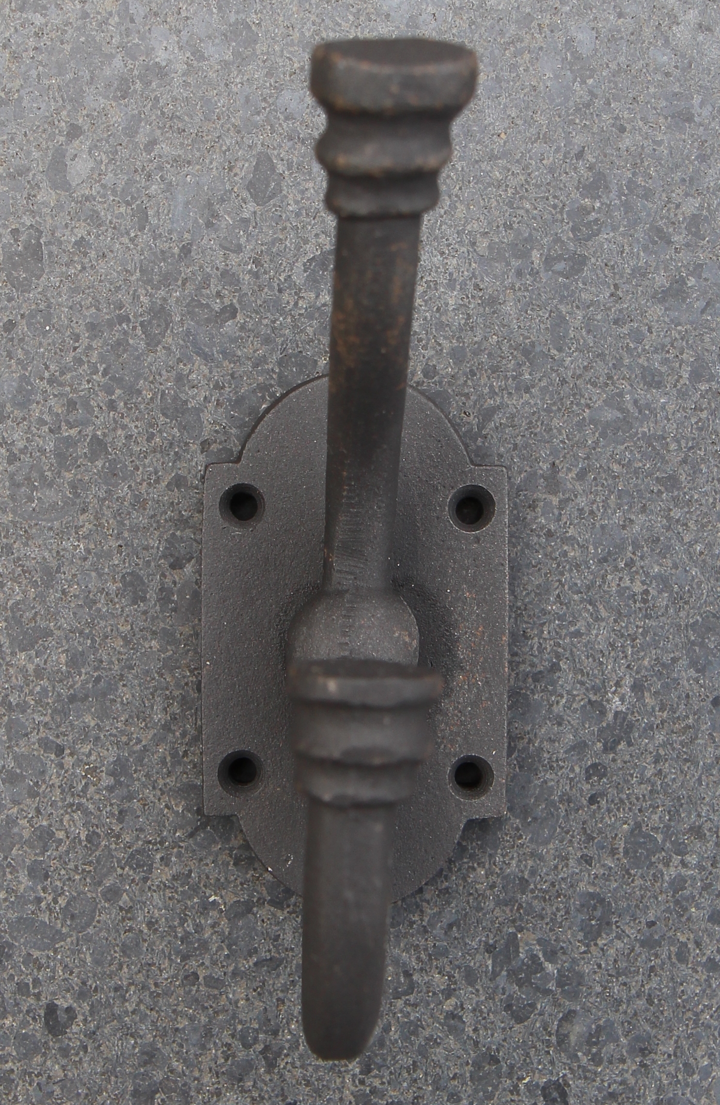 Gietijzeren donkerbruine kapstokhaak met grote wandplaat. Deze dubbele kapstokhaak