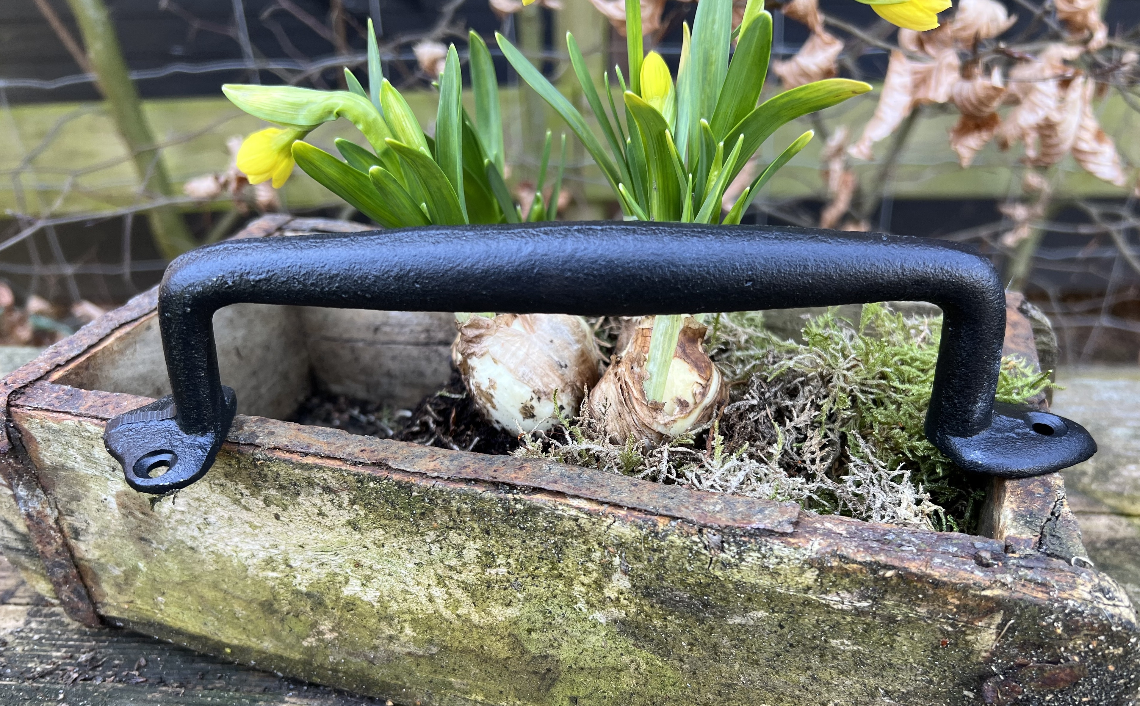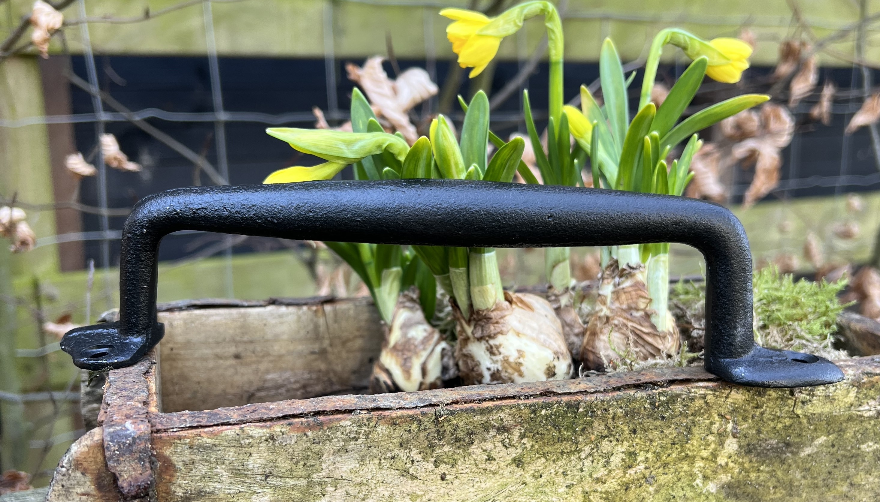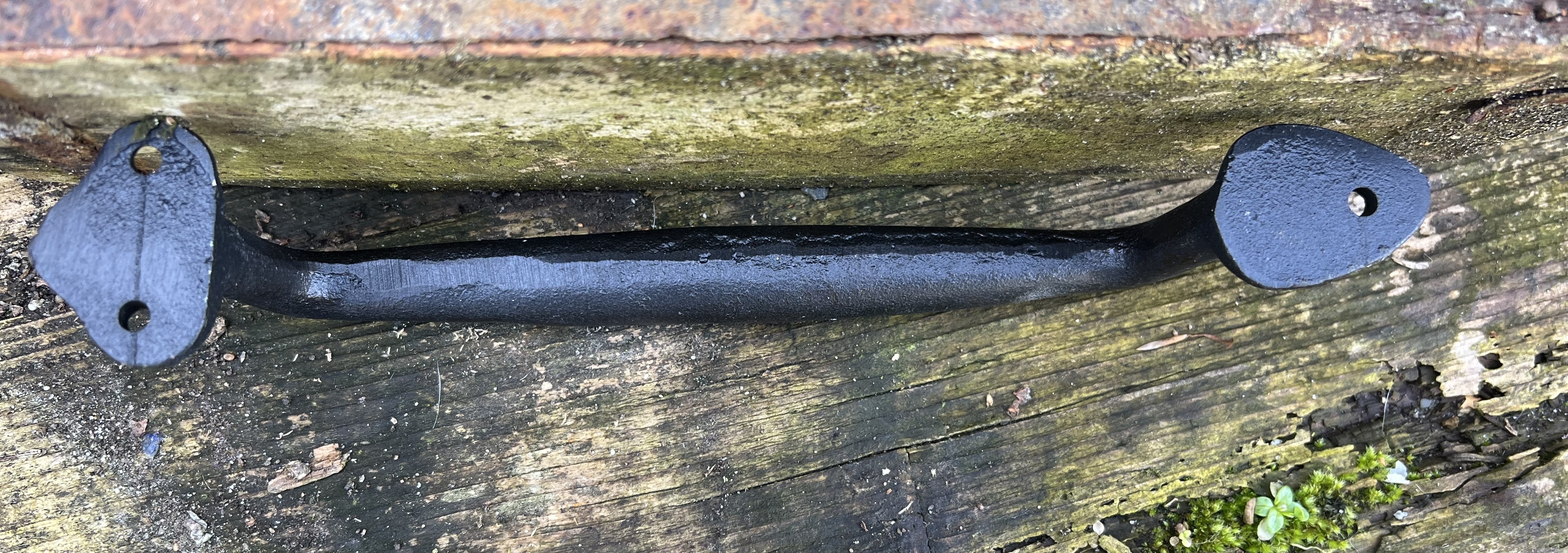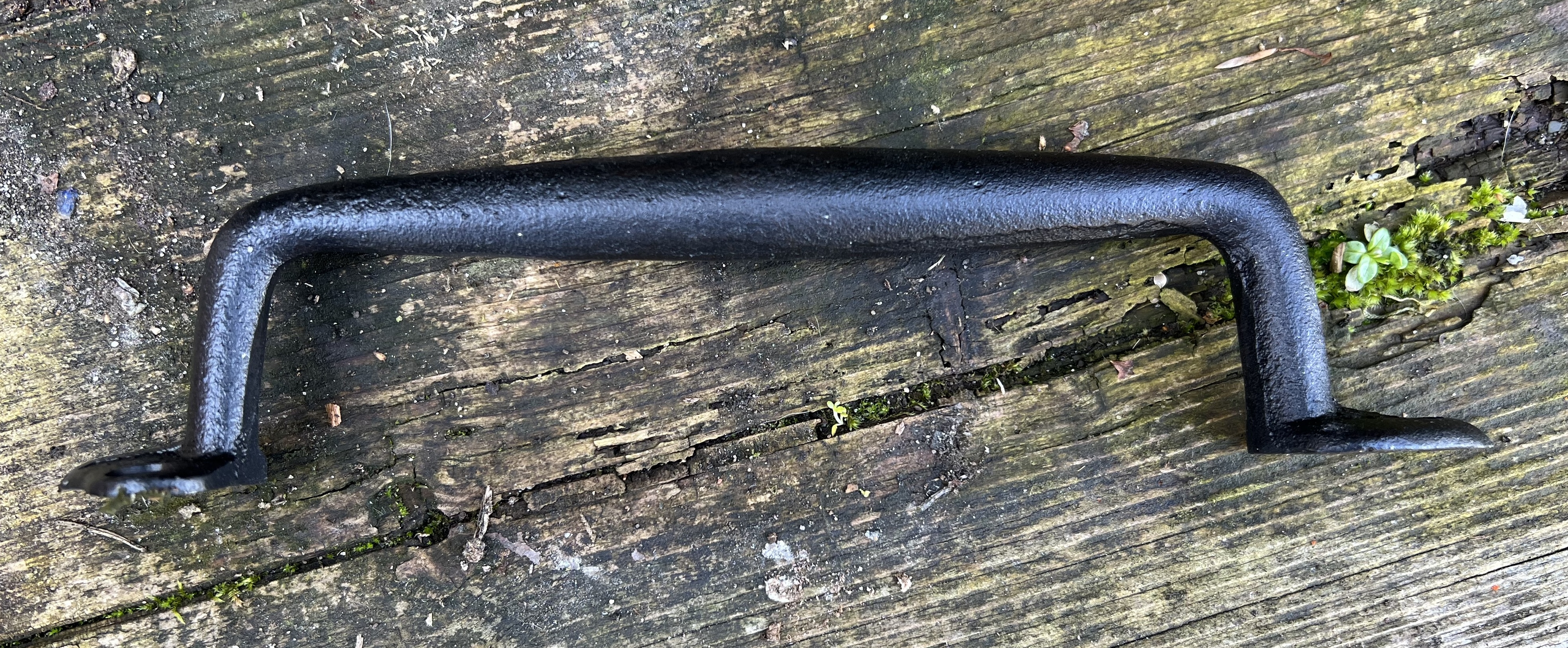 Een wat grotere handgreep van gietijzer uit 1 stuk gegoten in het zwart.
