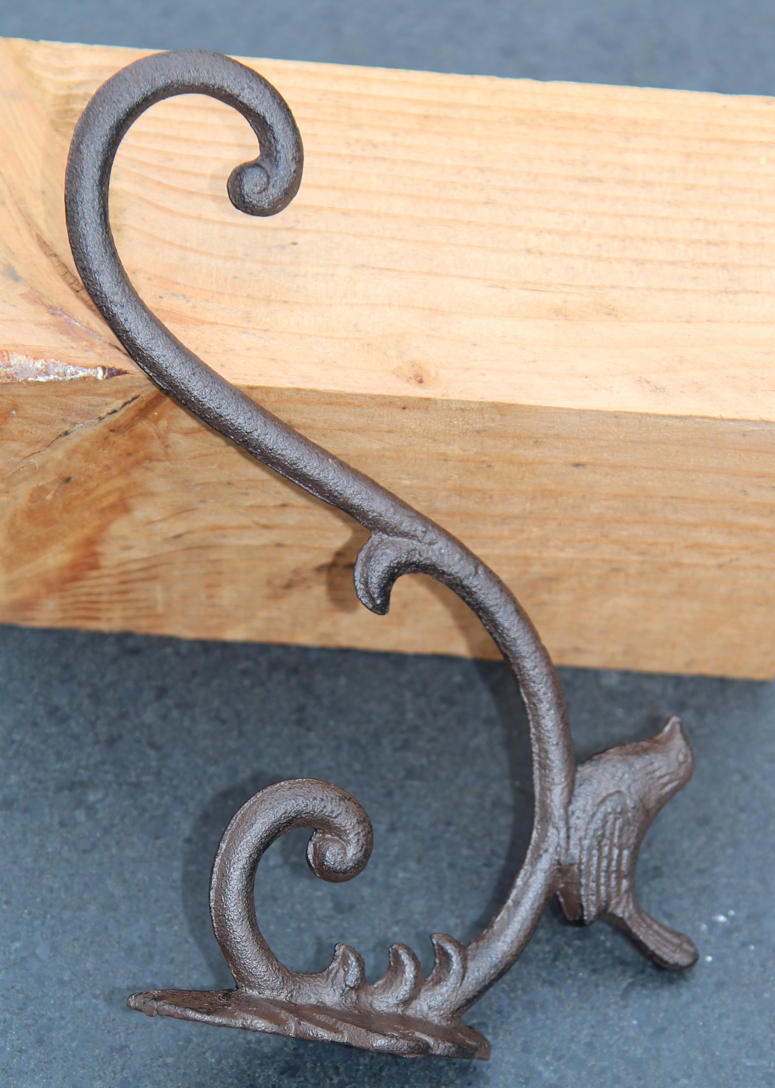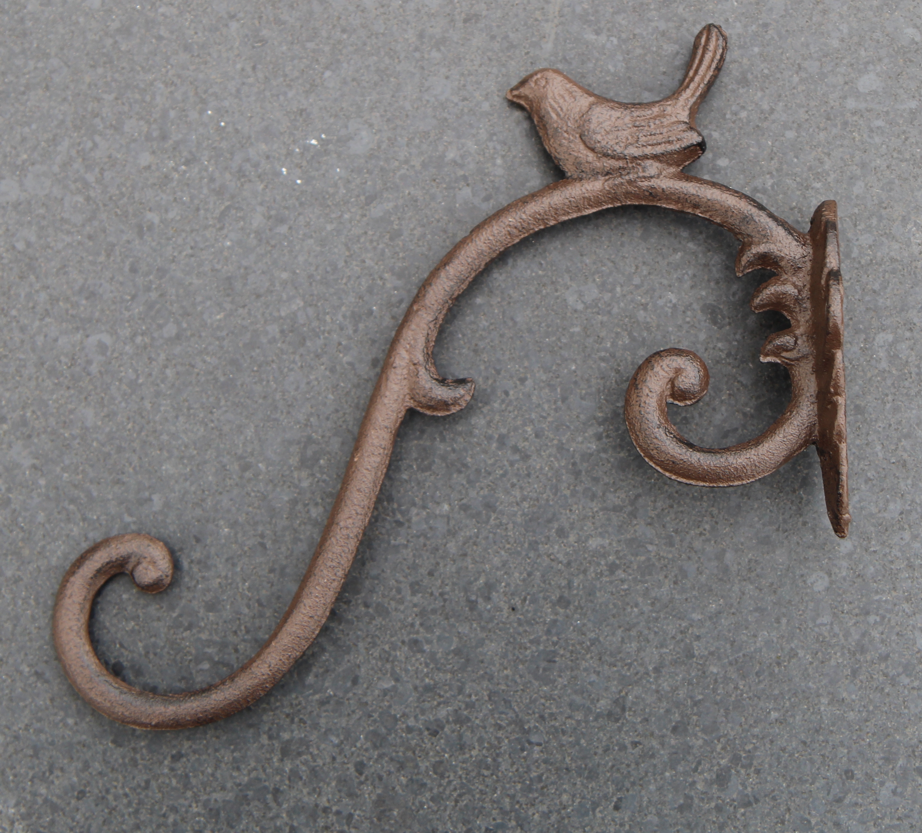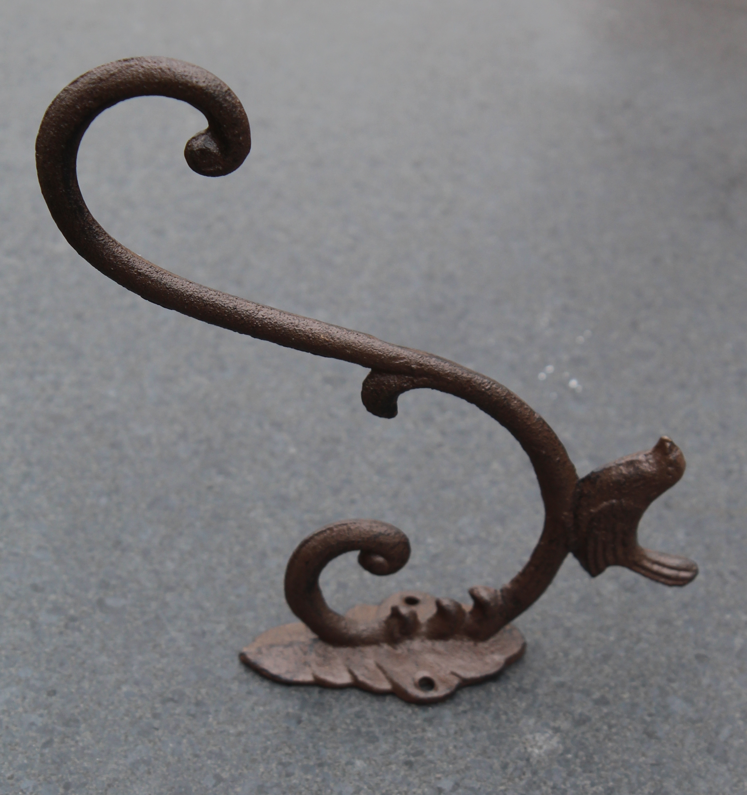 Antiek donkerbruine wandhaak van gietijzer met een vogeltje aan de bovenkant.